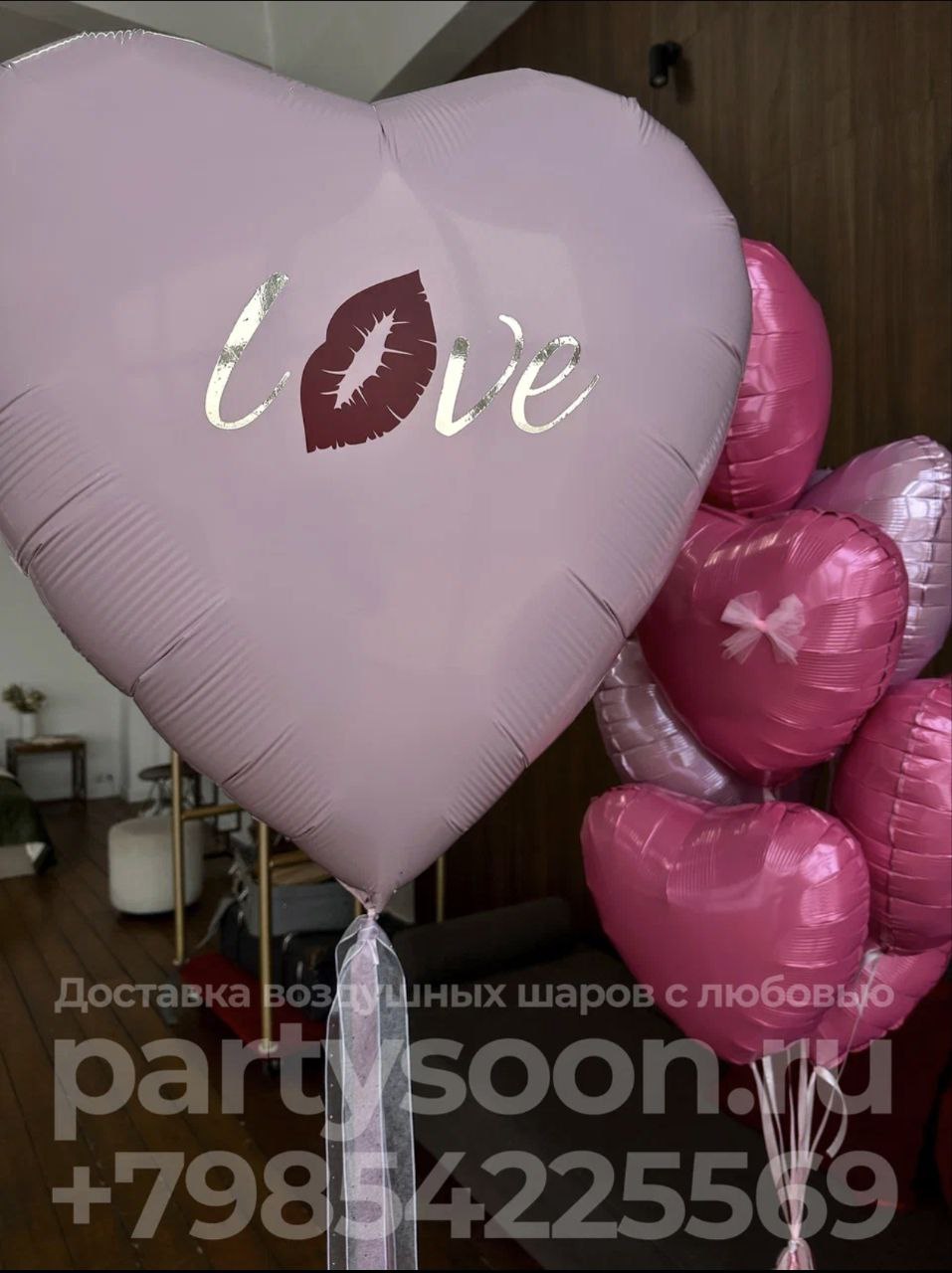 - большое розовое сердце 36"/90см с надписью "Love+губы"