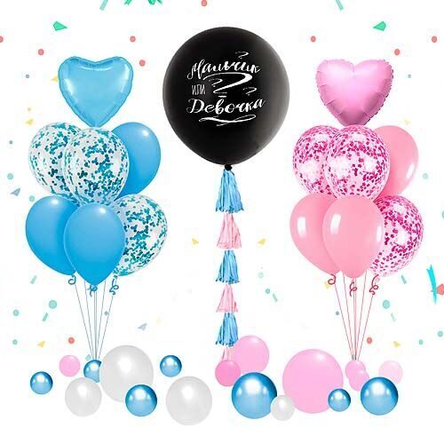 - Наполнение шара: конфетти и воздушные шары, согласно полу ребенка