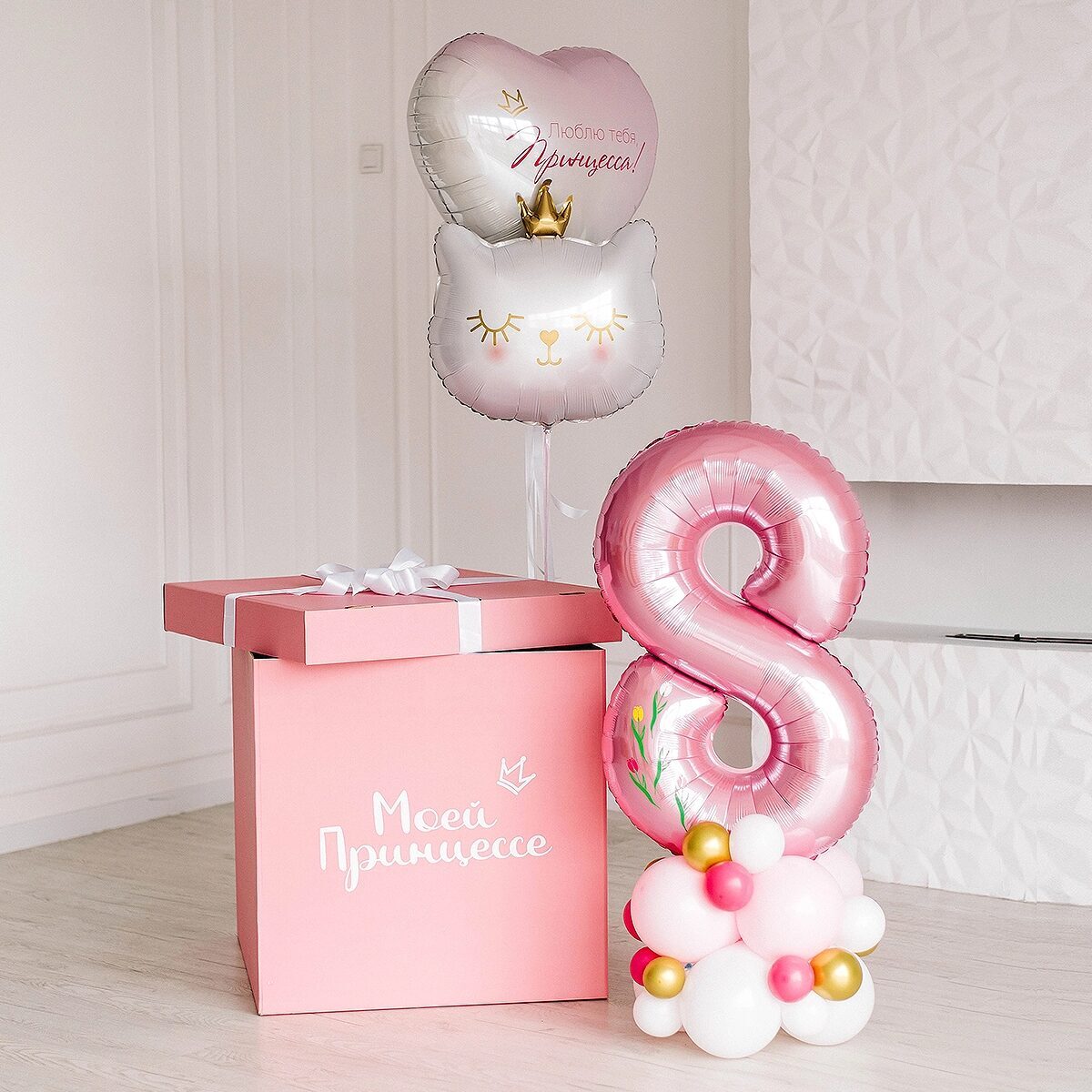 Композиция шаров с розовой коробкой-сюрприз с цифрой - это идеальный подарок для девочек, девушки, мамы и бабушки, для всех кто любит получать оригинальные и необычные подарки на 8 марта. Композиция воздушных шариков на 8 марта для девушки, состоит из розовых шаров, украшенных яркими лентами а также коробки-сюрприз, в которой можно спрятать маленький подарок. Этот подарок не только красивый но и незабываемый для любимого человека.