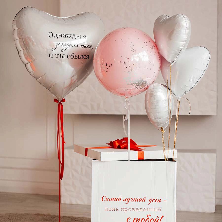- Фонтан из шаров в коробке: 3 сердец и кристальный шар