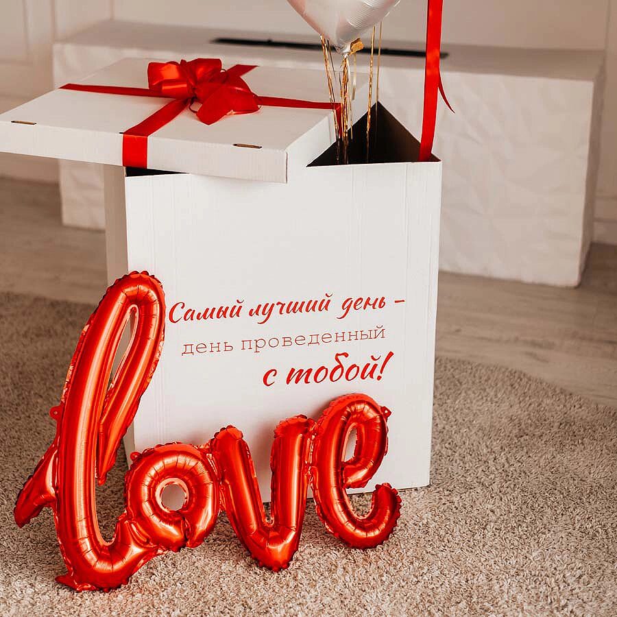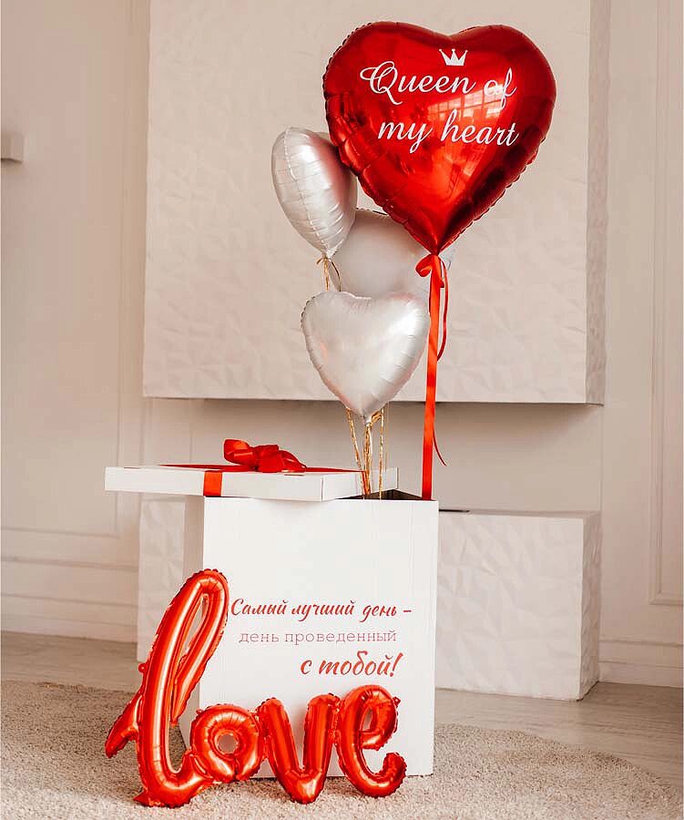 Коробка сюрприз белая с воздушными шарами сердце, яркий подарок для любимой девушки на День святого Валентина. В набор входит: