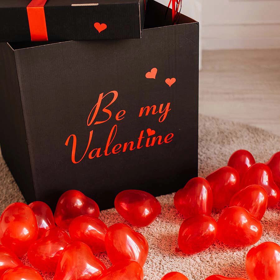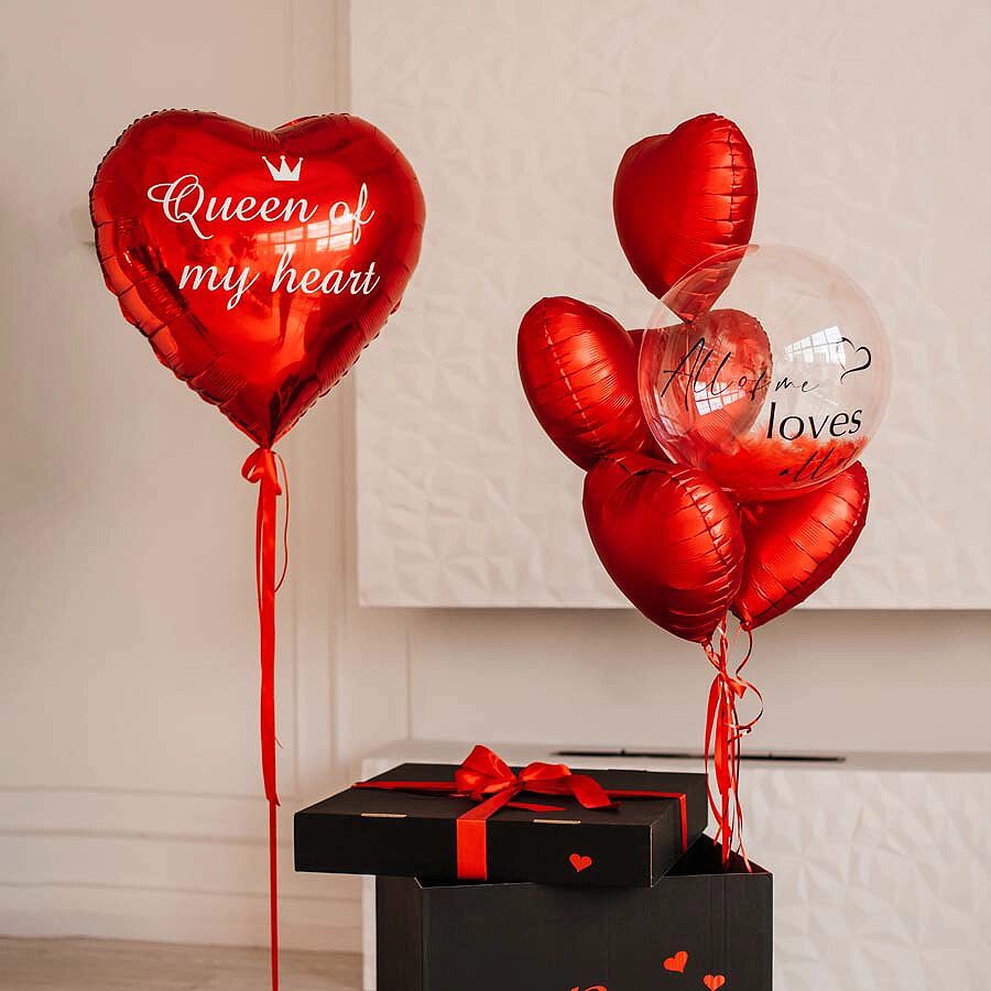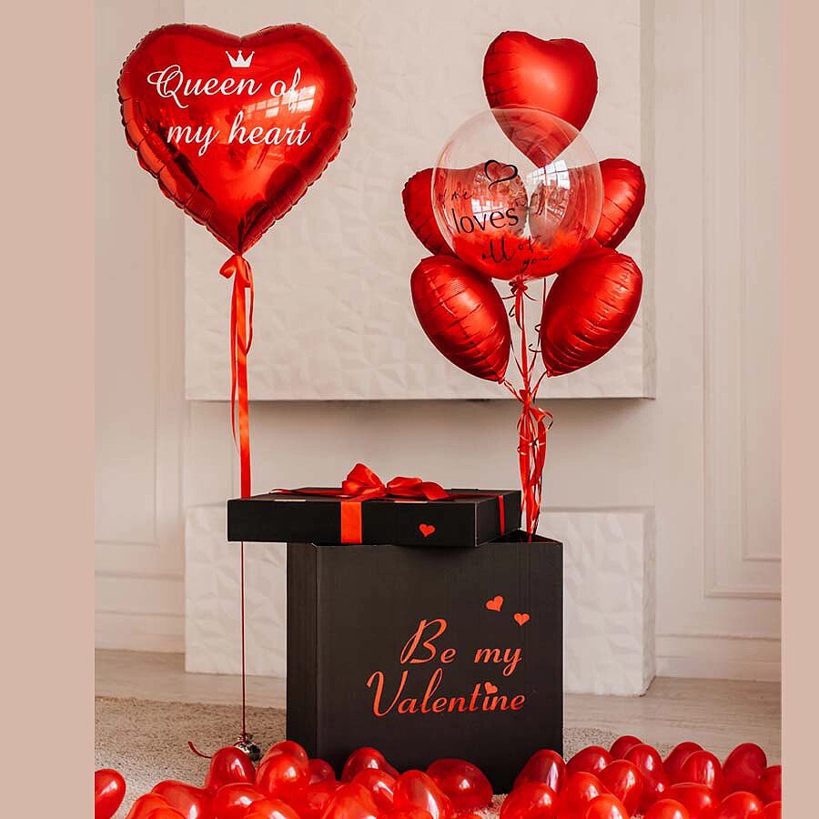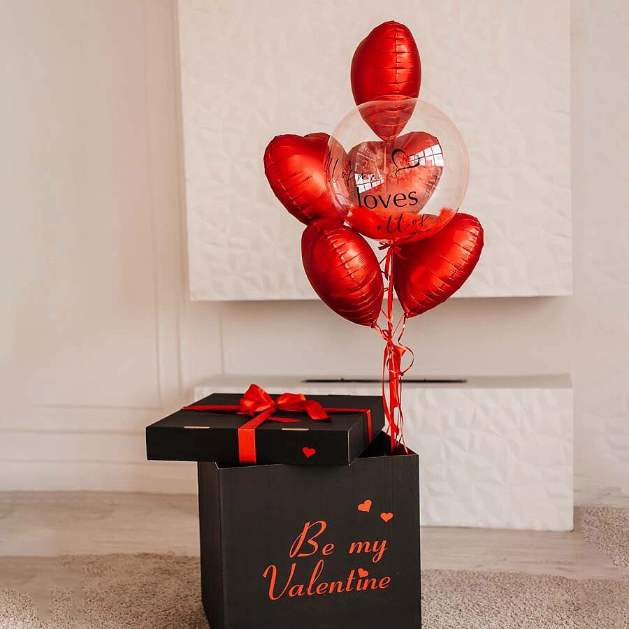 - Фонтан из шаров в коробке: 5 сердец и прозрачный шар с перьями