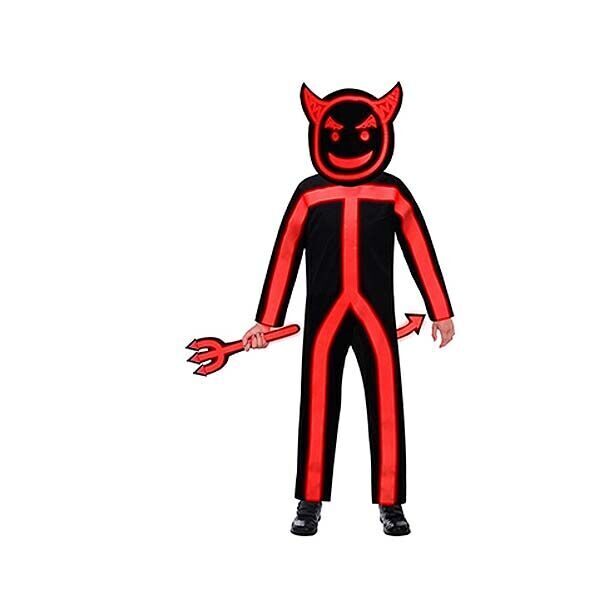 Детский карнавальный костюм дьявола, нарисованного линиями. В комплекте: комбинезон, хвост, трезубец, маска. Размер костюма для мальчика 4-6 лет. На рост 104-122 см.