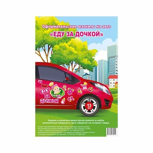 Поздравляем с прибавлением! Скорее забирайте своих принцесс из роддома! Украсить автомобиль на выписку поможет набор магнитов ЕДУ ЗА ДОЧКОЙ. На листе размером 29,5х43см расположены 13 элементов. Магниты прочно крепятся на любую металлическую поверхность, легко снимаются и не оставляют следов.