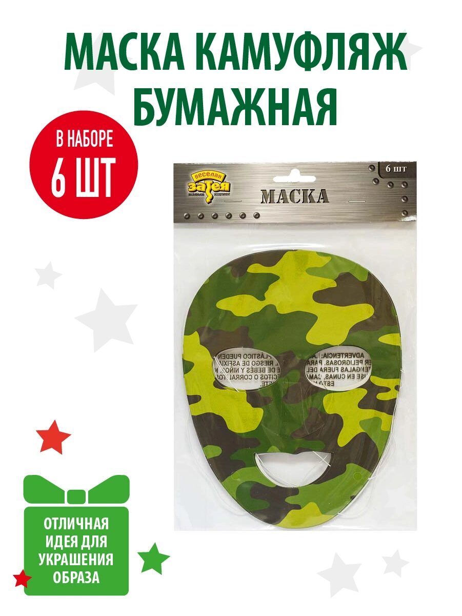 Шесть бумажных масок на резинке в стили милитари! Для самых брутальных вечеринок, празднования дней различных родов войск и 23 февраля.