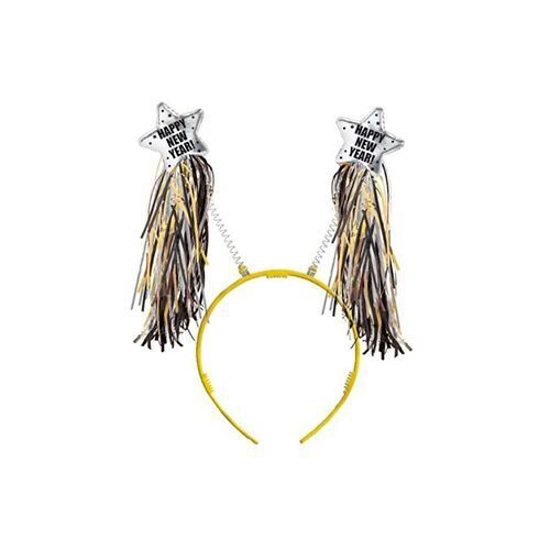 Пластиковый золотой ободок с двумя серебряными звездами Happy New Year на антенках, каждая из которых украшена дождиком! Отличный карнавальный аксессуар для новогоднего праздника.