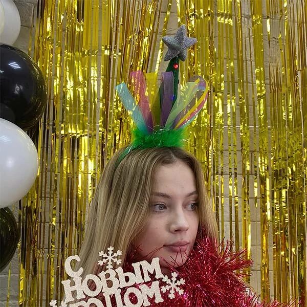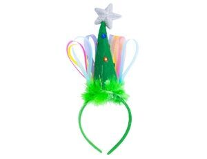Ободок с объемной елочкой, украшен зелеными перьями, цветными лентами и стразами - стильный аксессуар для новогодней вечеринки.
