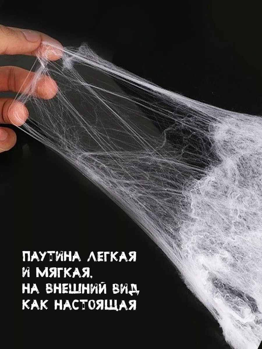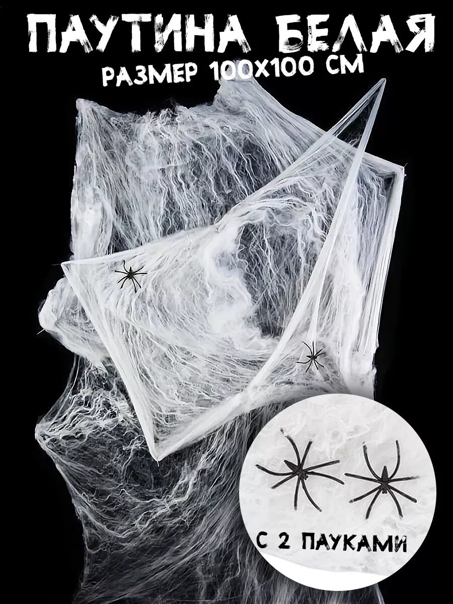 Вызвались организовать вечеринку Хэллоуин? Здорово! Что абсолютно точно поможет создать таинственную и устрашающую атмосферу? Паутина. Она должна быть везде: на стенах, мебели, в углах, вокруг угощений. Белая паутина с 2 пауками - отличное решение для украшения помещения вашей жуткой вечеринки.