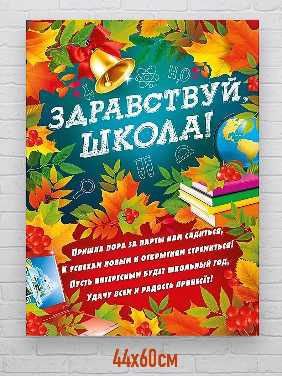 Красочный плакат для начальной школы. Плакат на школьный праздник 1 Сентября - Здравствуй Школа! Размер плаката 44х60см. Формат - А2. Рисунок - яркий односторонний с надписями на тему школьного праздника 1 сентября. Плакат на стену с большой надписью Здравствуй Школа, осенними листьями Клена и конечно же с главным атрибутом школьного праздника - Золотой колокольчик с красной ленточкой. Яркий подарок первокласснику. Плакат легко закрепить на стене, повесить на окно, в школьном классе для мальчиков и девочек.