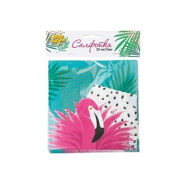 Розовый фламинго на фоне приглушенной лазури и пальмовых ветвей – тропический рай, где море и небо бескрайни, жизнь безмятежна, веселье бесконечно! Приглашайте друзей на Фламинго-пати! В упаковке 12 двухслойных бумажных салфеток размером 33 см.
