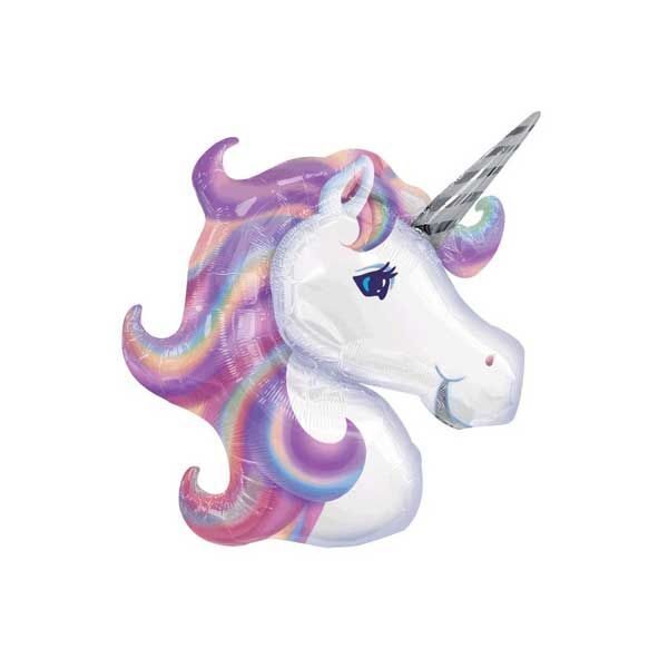 Сложная, объемная фигура в форме головы единорога. Материал - тонкая миларовая (фольга на полиэтиленовой основе) пленка позволяет шарам не сдуваться от недели до одного месяца.