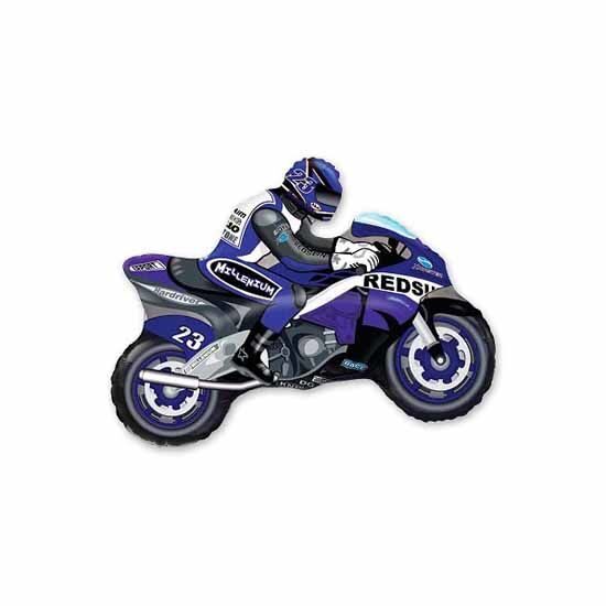 Быстрый синий мотоцикл несется по улицам города! Посторонись! Фольгированный шар продается надутым. Шар имеет встроенный клапан для простого надувания и закрепления ленты.