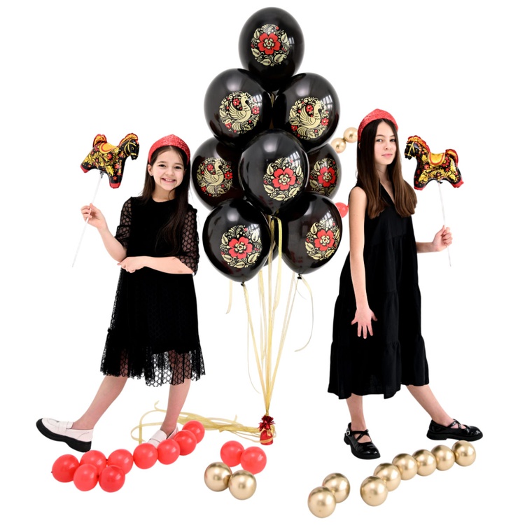Воздушные шары в стиле хохломы: праздник, который дышит традициями. Чёрные шары, словно полотна старинной росписи, украшены золотыми птицами и алыми цветами. Это не просто декор — это кусочек русской души на вашем празднике! Уникальный дизайн: Мотивы хохломы превращают обычный шарик в произведение искусства.