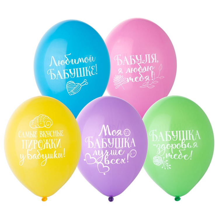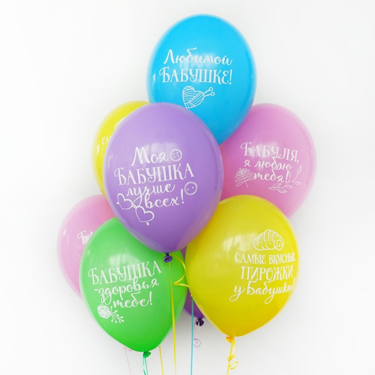 Высококачественный шар из натурального латекса. Ассорти из нескольких цветов. Одного типа - пастель - матовый оттенок цвета. Шары с двусторонним шелкографическим рисунком повсященных Бабушке, в пакете с большим полем печати. "Бабуля, я люблю тебя", " Любимой Бабушке", "Моя Бабушка лучше всех", "Самые вкусные пирожки у Бабушки", "Бабушка - здоровья тебе!" .