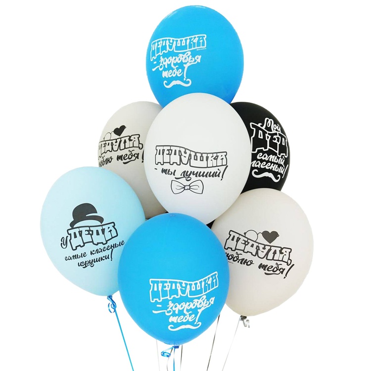 Высококачественный шар из натурального латекса. Ассорти из нескольких цветов. Одного типа - пастель - матовый оттенок цвета. Шары с двусторонним шелкографическим рисунком повсященных Дедушке, в пакете с большим полем печати. "Дедушка - ты лучший", "Дедуля - люблю тебя!", "Дедушка - здоровья тебе", "Мой Дед самый классный!", "У Деда самые классные игрушки".