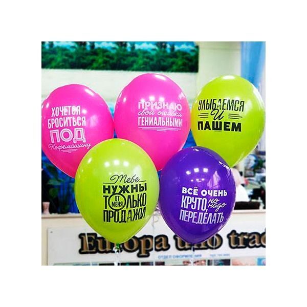 Высококачественный шар из натурального латекса. Ассорти из трех цветов, одного типа - пастель - матовый оттенок цвета. Шары с двусторонним шелкографическими рисунком - надписями: Всё очень круто, но надо переделать. Хотелось как лучше, а получилось идеально. Хочется броситься под кофемашину. Признаю свои ошибки гениальными. Улыбаемся и пашем. Тебе нужны от меня только продажи. Идеальный ассортимент для розничной продажи воздушных шариков и украшения праздника. Воздушные шары изготавливаются из экологически безопасного 100%-ного натурального латекса. В окружающей среде разлагаются на безопасные компоненты примерно с той же скоростью, как обычные листья деревьев. После использования лопнуть и утилизировать как бытовой отход.