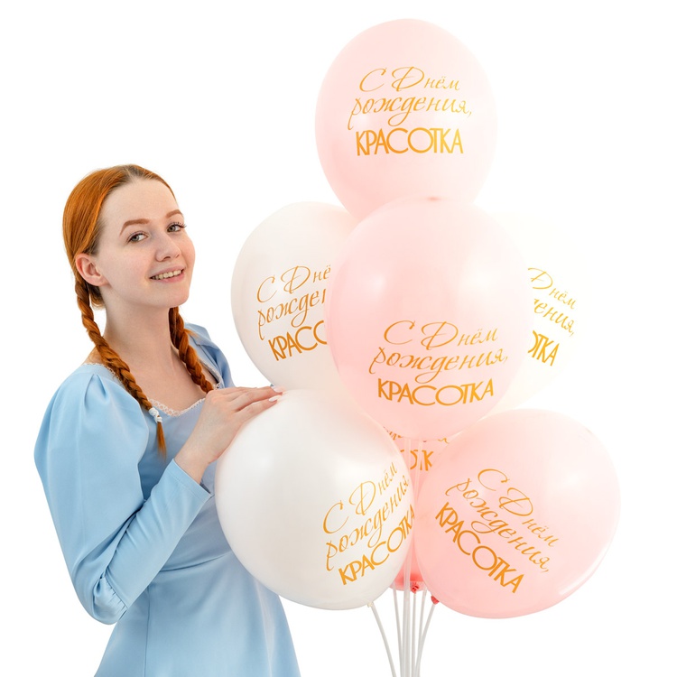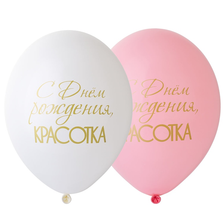 Высококачественный шар из натурального латекса. Ассорти из двух цветов (розовый и белый), одного типа - пастель - матовый оттенок цвета. Шары с двусторонним шелкографическим рисунком-надписью С Днем Рождения, Красотка. Золотой принт с большим полем печати.