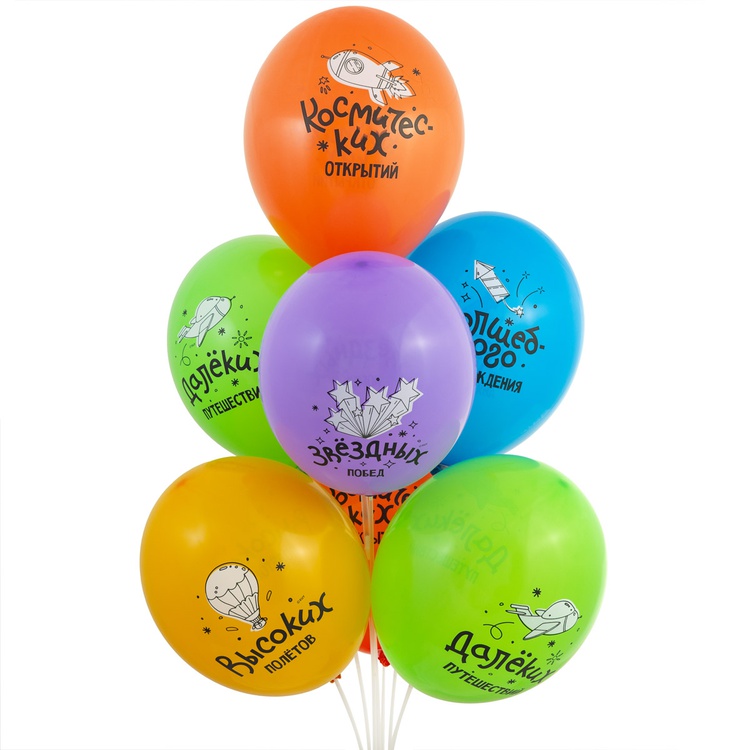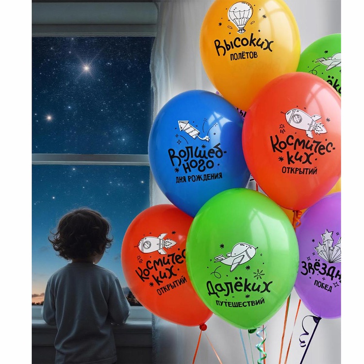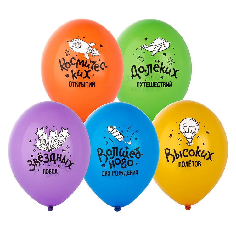 Перед вами набор из пяти ярких воздушных шаров, каждый из которых не только украшает пространство, но и несёт вдохновляющее послание. Шары выполнены в насыщенных цветах и украшены забавными рисунками и мотивирующими надписями на космическую тему. Эти шары создают атмосферу праздника, вдохновения и мечтательности. Космическая тематика пробуждает воображение, а мотивирующие надписи поднимают настроение и заряжают позитивной энергией.