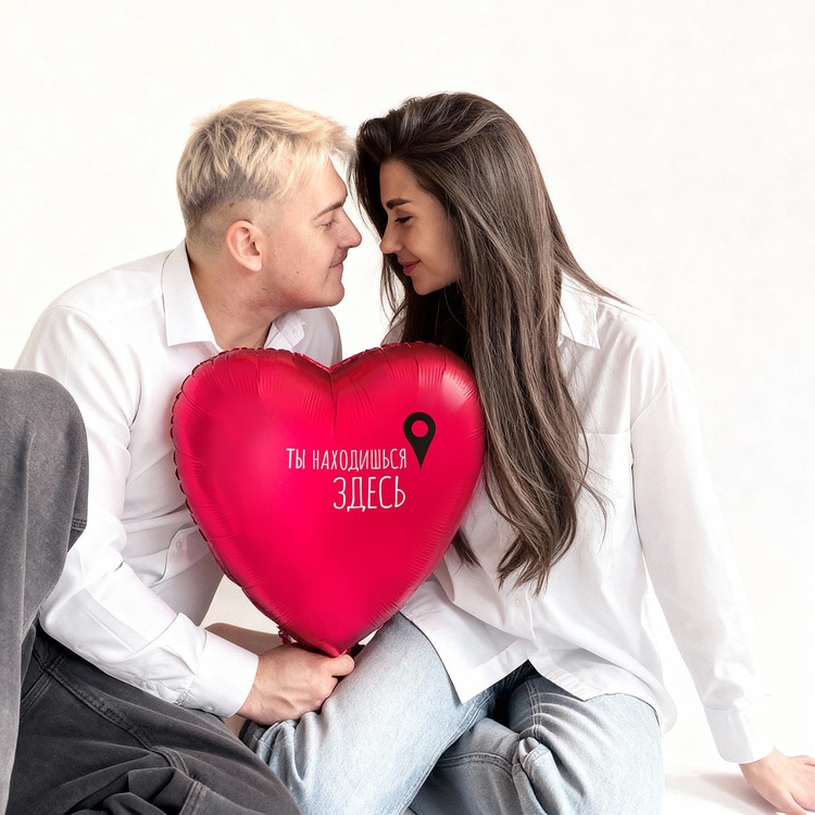 Фольгированный шар размером 18"/ 46см в форме сердца с оригинальным текстовым дизайном. Надпись "Ты находишься здесь" вместо классического "Я тебя люблю"- прекрасный способ выразить свои чувства и завуалированно признаться своей второй половинке в любви. Шар изготовлен из тонкой миларовой пленки (фольга на полиэтиленовой основе). Шар имеет встроенный клапан, что упрощает надувание. Для надува рекомендуется использовать гелий. Внимание! Реальный цвет товара может незначительно отличаться от представленного на фотографии в зависимости от настроек вашего монитора.
