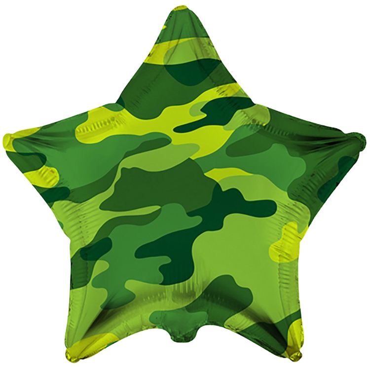 Фольгированный шар в форме звезды с насыщенным камуфляжным рисунком будет уместен для поздравления с 23 февраля и праздниками отдельных родов войск! Выполнен из миларовой пленки, благодаря чему шар летает более 7 дней.