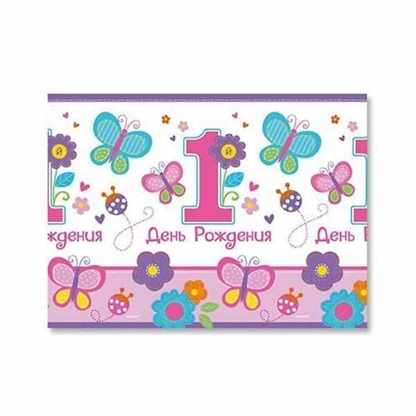 Цветы и сердца, божьи коровки, и, конечно, бабочки. Вашей красавице уже 1 год! У скатерти на отмечание годовасия основной рисунок ра сположен по канве, а середина - белая, чтобы на ней были заметнее посуда и угощения. Размер скатерти 1,4х2,4м, выполнена из полиэтилена.
