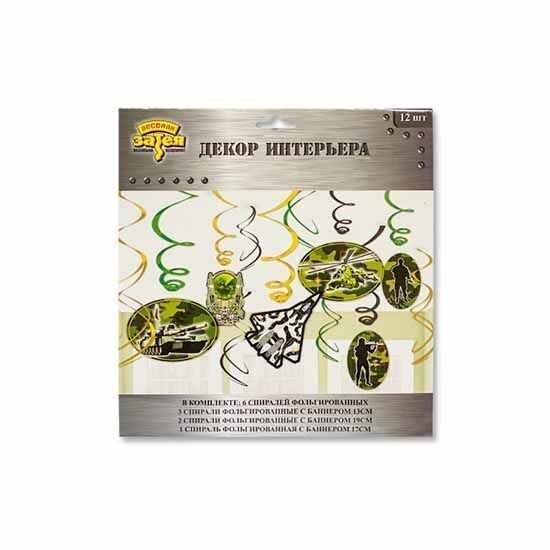 Черные, золотые и зеленые блестящие спирали с российской военной техникой. В упаковке 6 спиралей с декорациями и 6 без подвесок. К каждой спиральке прикреплено пластиковое колечко для удобного крепления.