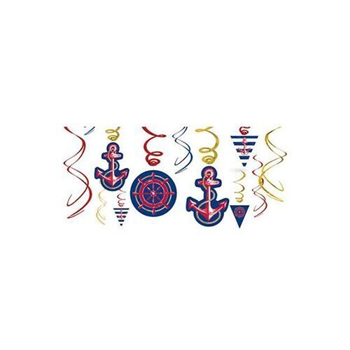 Морская вечеринка заиграет ярче с блестящими спиралями с якорями и штурвалами! В наборе 6 спиралей с картинками и 6 просто блестящих в красно-синих цветах. Каждая спираль снабжена колечком для крепления.