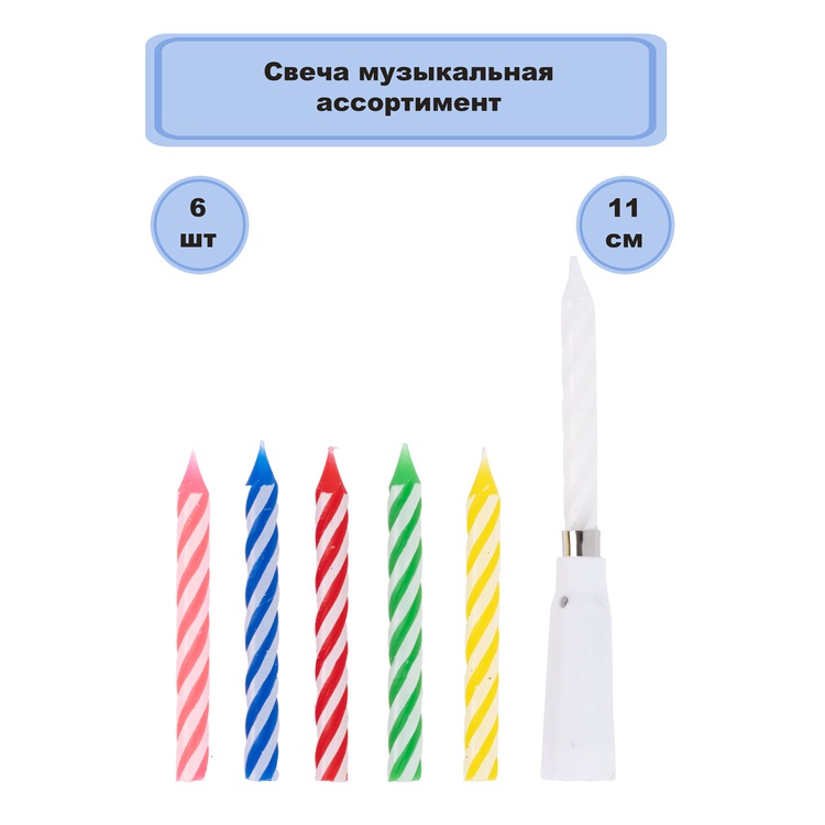 Музыкальная подставка для свечи с мелодией ""Happy Birthday"" и 6 больших свечей - отличное решение для декорирования торта, десерт о Дню рождения. В наборе в качестве примера на подставку помещена белая свеча, но Вы можете заменить ее на любую другую! Экологически чистый состав, оригинальный дизайн. Happy birthday to you!