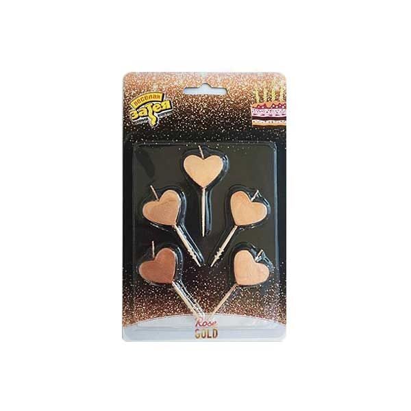 Свечи для торта на пиках Сердца Роз. зол. 5шт