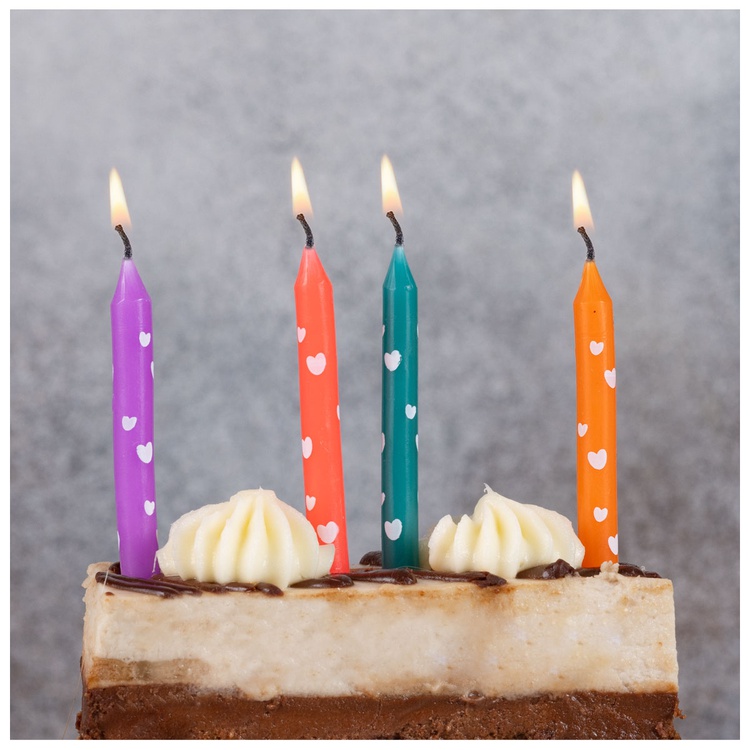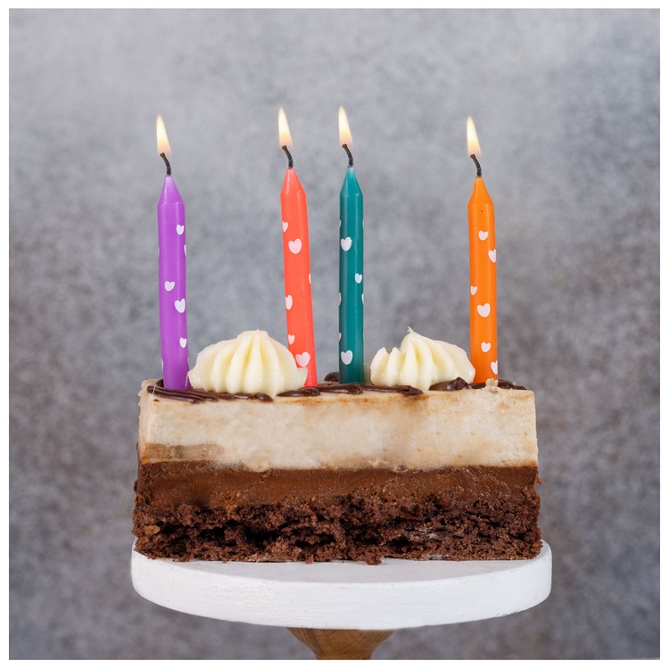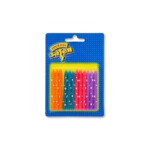 Разноцветные свечи с белыми сердцами - по 3 штуки каждого цвета - апельсиновые, розовые, сиреневые и цвета морской волны. Экологически чистый состав. Высота свечи 6,5 см, в упаковке 12 штук. Рекомендуем дополнительно приобрести подставки для свечей