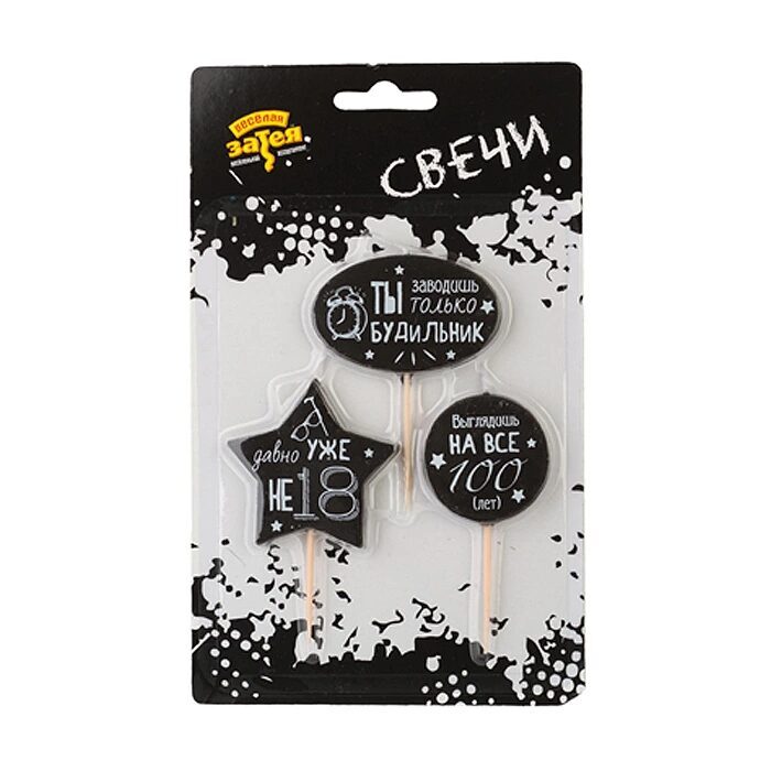Черно-белые свечи с прикольными надписями - супер оригинальное украшение торта! В упаковке 3 свечи на пиках, надписи на свечах универсальные, юморные.