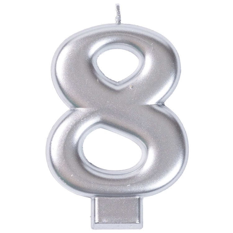 Серебряные цифры - яркое обозначение даты события, особенно если это юбилей или памятная дата. Такая свеча будет замечательно смотреться на строгих и даже самых простых тортах. Высота цифры 8 см, выполнена из стеарина.