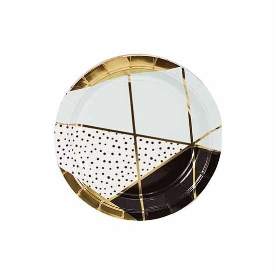 Стильная бумажная тарелка с золотым фольгированным тиснением. Используется совместно с другими элементами коллекции как украшение ст ола или по своему непосредственному назначению. Размер 17см, 6 штук в упаковке.