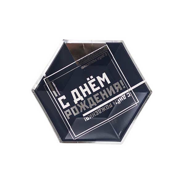 Индиго и сталь – два холодных, благородных оттенка, идеальных для празднования Дня рождения настоящего мужчины! В дополнении к дизайну – печатные буквы, гексаформы, прямые линии. В упаковке 6 бумажных тарелок размером 23 см