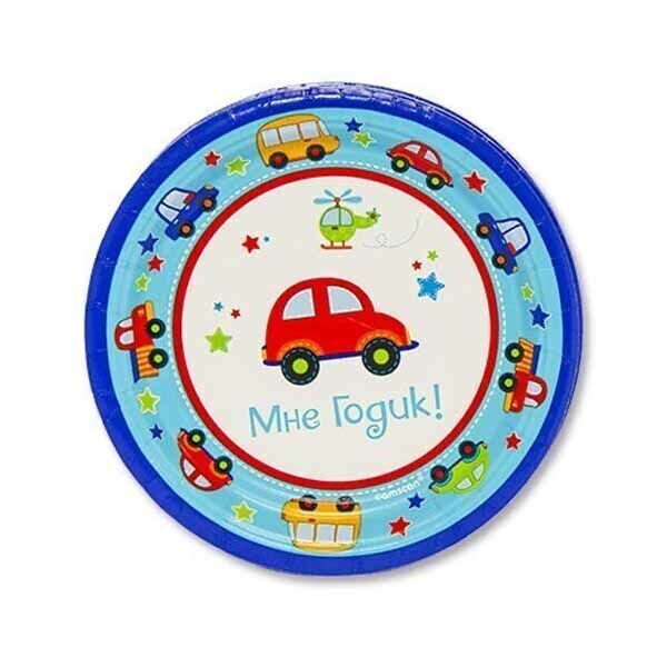 Первый день рождения сына в окружении машин и самолетов, пароходов и паровозов! В упаковке 8 ламинированных бумажных тарелок размеро м 17 см с надписью Мне Годик.