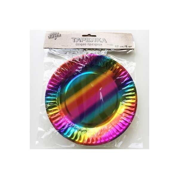 Блестящая градиентная посуда и аксессуары, переливающиеся всеми цветами радуги, не останутся не замеченными ни на одной вечеринке! В упаковке 6 бумажных металлизированных тарелок размером 17 см.