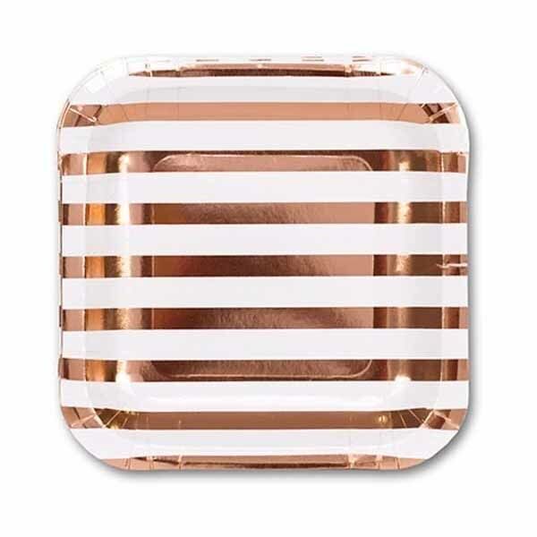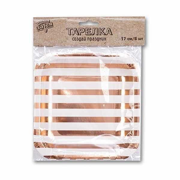 Стильные бумажные тарелки с полосками цвета розового золота. Универсальны, подходят для любого праздничного фуршета. В упаковке 6 тарелок размером 17 см.