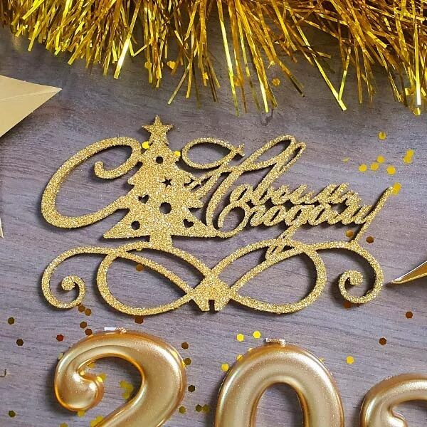 Деревянный топпер с надписью "С Новым Годом" для украшения праздничных десертов и композиций. Общая высота топпера 27 см. Длина баннера с надписью - 26см, высота - 9см. В комплекте представлены баннер и палочка (на баннере есть отверстие, в которое вам нужно вставить палочку). Баннер украшен золотым глиттером (нанесение с одной стороны).