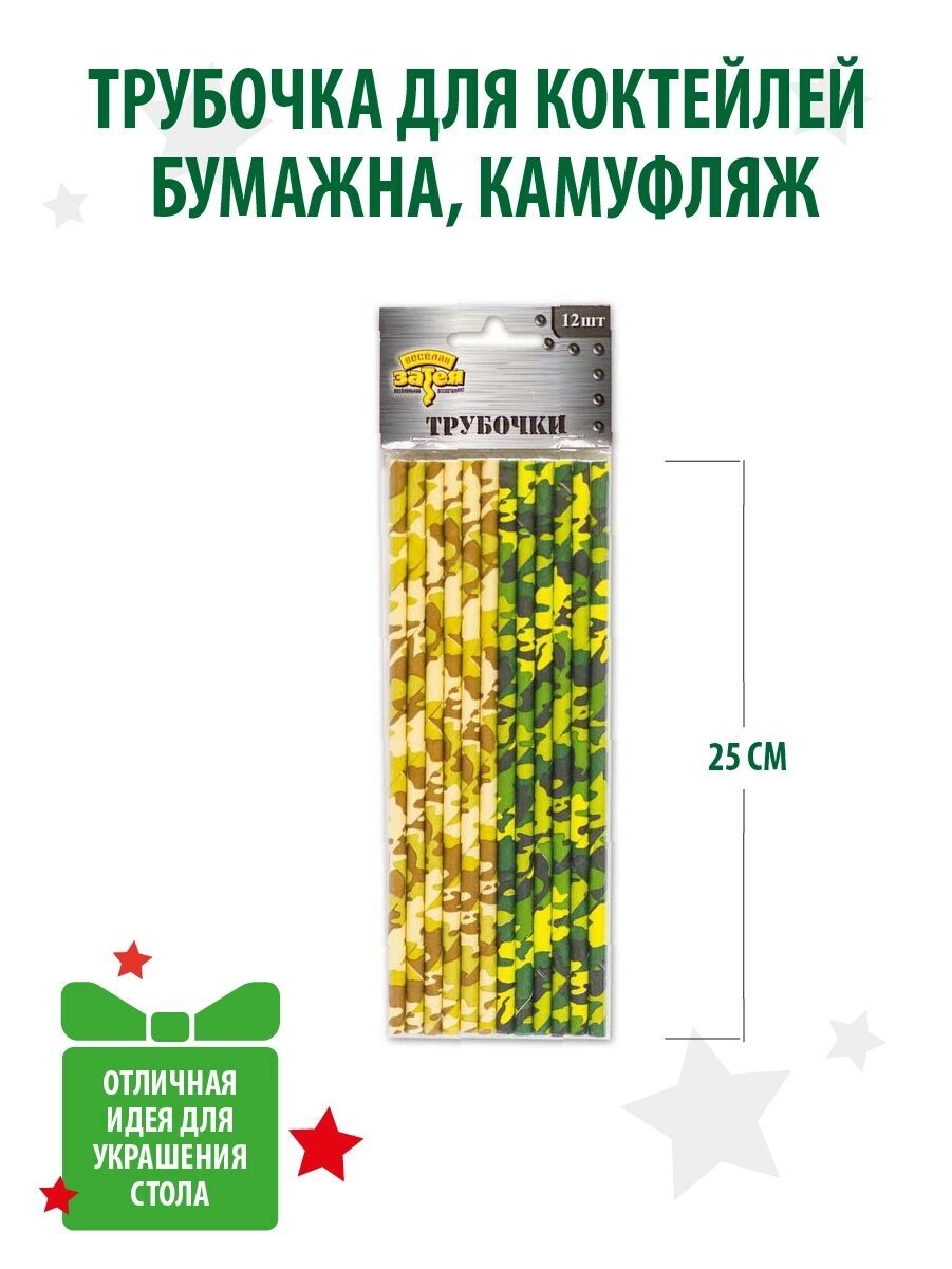 Бумажные соломинки для коктейля в стиле милитари - 6 штук цвета песочно- коричневого цвета и 6 штук классического зеленого камуфляжа .