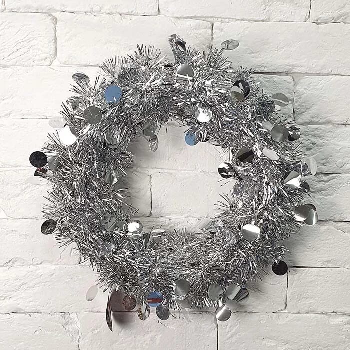 Блестящий рождественский венок украшен кругами-монетками, которые дрожат от малейшего дуновения ветра и создают хрупкую атмосферу новогоднего чуда.