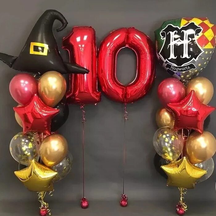 Большая композиция из воздушных шаров с красными цифрами. Отличная идея украсить день рождение, именины или вечеринку в стиле Гарри Поттер. Подарок мальчику на 10 лет.
