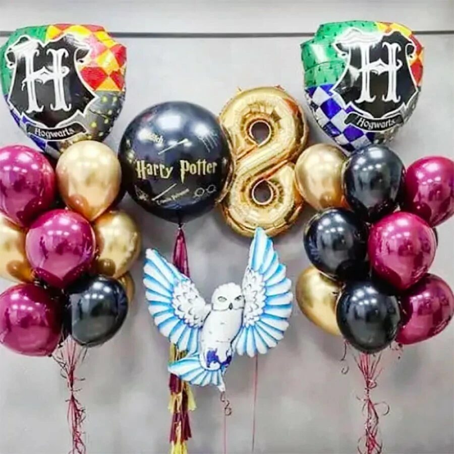 Большая композиция из воздушных шаров с воздушными шарами фигурами шары гербы, шар сова и золотой цифрой 8. Отличная идея украсить день рождение, именины или праздничную вечеринку в стиле Гарри Поттер. Подарок мальчику или девочке день рождение 8 лет.