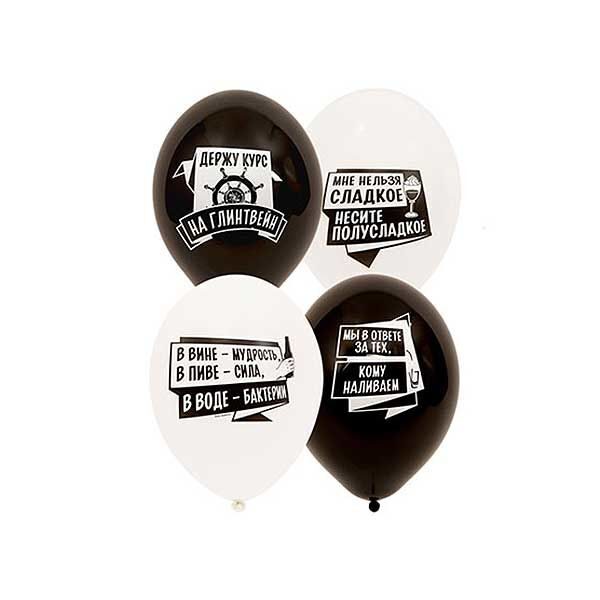 Белые и черные шары с алко-афоризмами. Фразы: Мне нельзя сладкое, несите полусладкое; Мы в ответе за тех, кому наливаем; Не алкаш, а дегустатор; В вине - мудрость, в пиве - сила, в воде – бактерии; Держу курс на глинтвейн. Правильные слова для правильной компании!